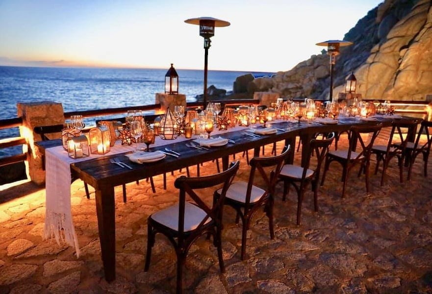 www.esperanzaresort.com/dining/. Hotel Esperanza is just outside of Cabo on the corridor and is a gorgeous resort. The tables are set out over the rocks and the waves crashing in below. It is truly stunning. A little heavy on the pocketbook (entrees are between $30 and $45) but well worth it. Enjoy a cocktail before or after dinner in their lounge area, El Bar, it has a beautiful fire pit and lives music. You might even catch a glimpse of a movie star as it tends to be a destination for the stars. You must reservations for access to the property.